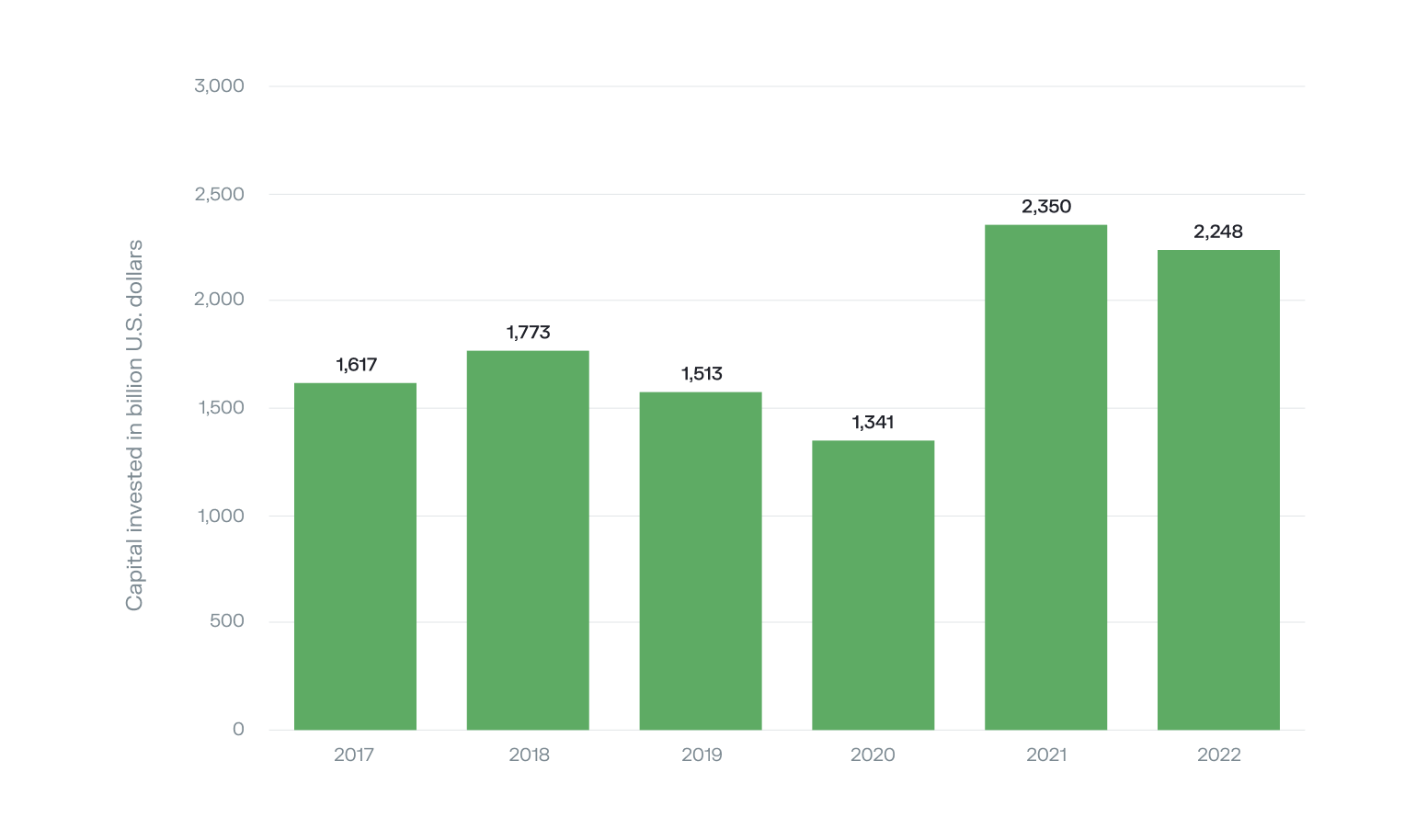 Source: Statista. Value of private equity (PE) capital invested worldwide from 2017 to 2022