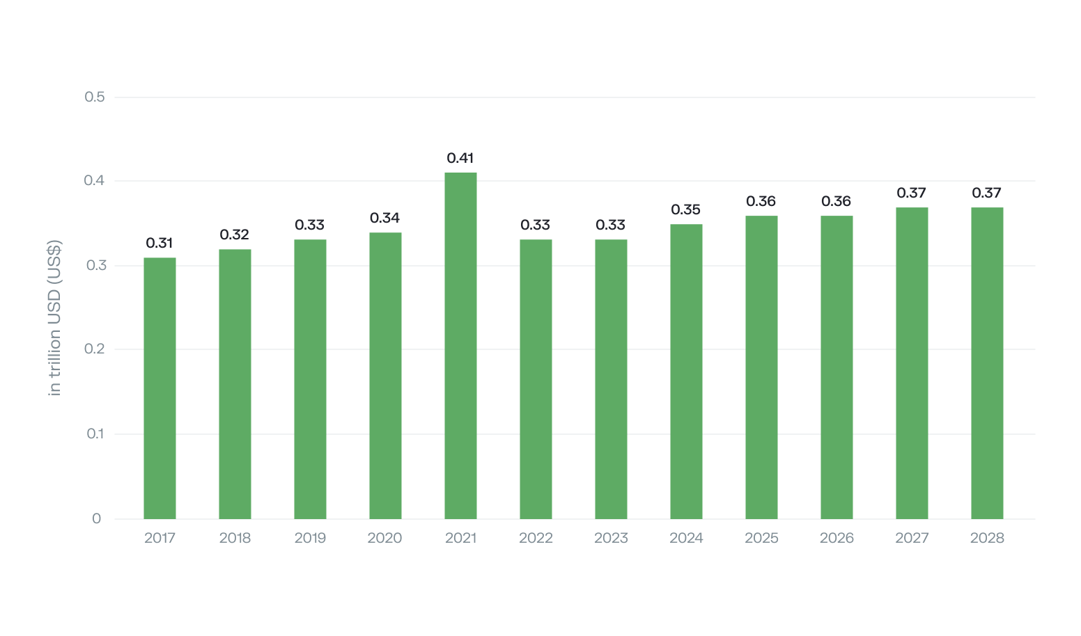 As of the end of 2023, the global revenue of investment banks was estimated to reach $0.33 trillion. It’s expected to grow at a compound annual growth rate (CAGR) of 2.31% and reach $0.37 trillion by 2028.